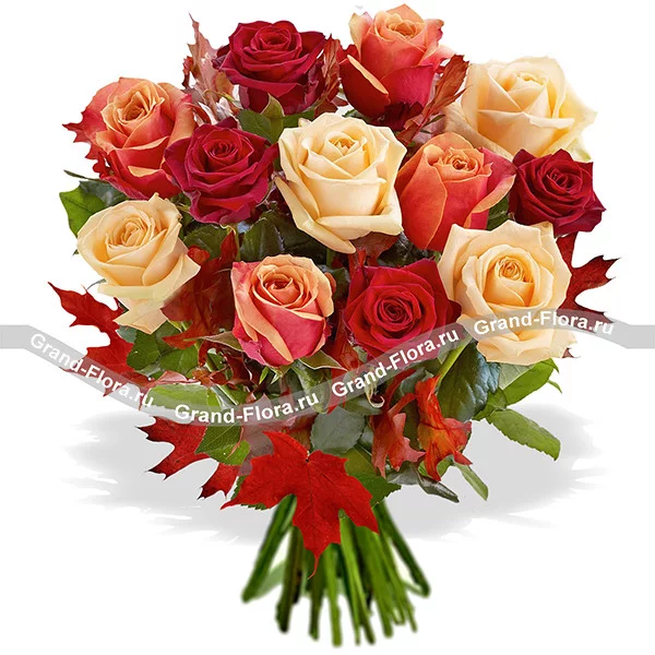 15 роз: роза красная - 6 шт.(70см), роза оранжевая - 5 шт.(70см), роза кремовая - 4 шт.(70см), Декор - осенние листья/ или упаковка.
