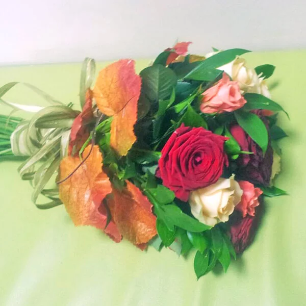 Выигрышное сочетание роз трех оттенков – нежного кремового, страстного красного и пленительного оранжевого – поможет выразить чувство благодарности и уважения. Дополненный осенними листьями букет не оставит равнодушной его получательницу